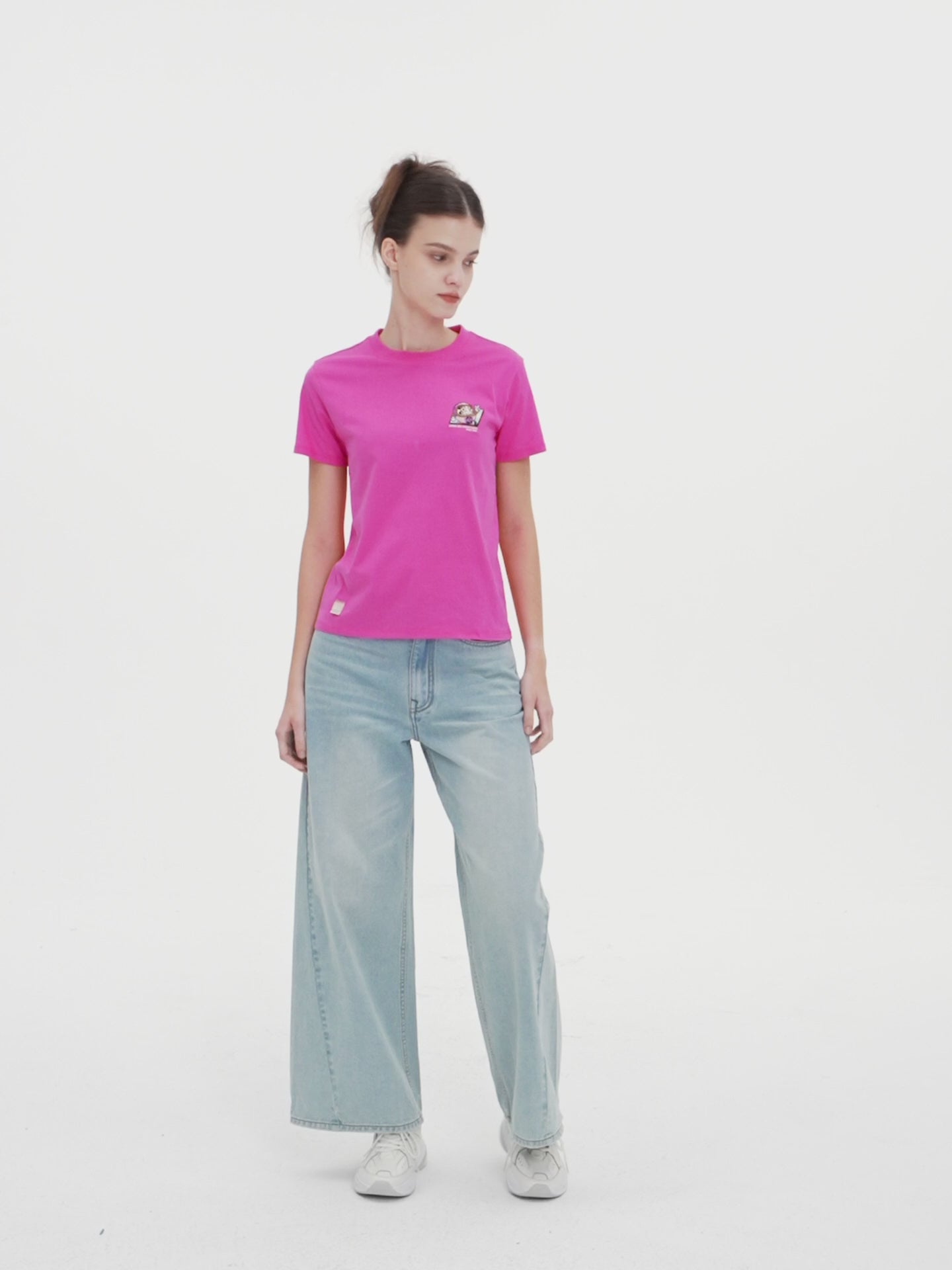 The adorable "Yay" gesture of Daruma is perfectly embroidered on the front of this T-shirt, complemented by vibrant colors, along with the three-dimensional seagull print on the back, showcasing a fun and lively fashion style.